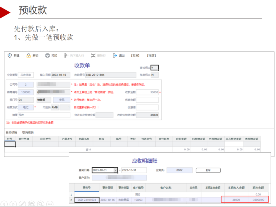 先收款后出庫,需做收款核銷:1、先做一筆預(yù)收款;2、銷售出庫后,再進(jìn)行收款核銷。